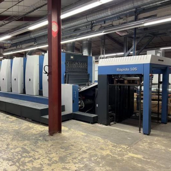 KBA Rapida 105-5 L FAPC ALV2 CX – Hybrid UV & LED-UV (2019) A feature-rich B1 offset press (72*105 cm, 5 colors), equipped with auto plate change, inline coating tower, extended delivery (ALV2), and dual drying systems (UV & LED-UV). With only 64 million impressions, this machine is in excellent condition and ready to power your premium print production.
