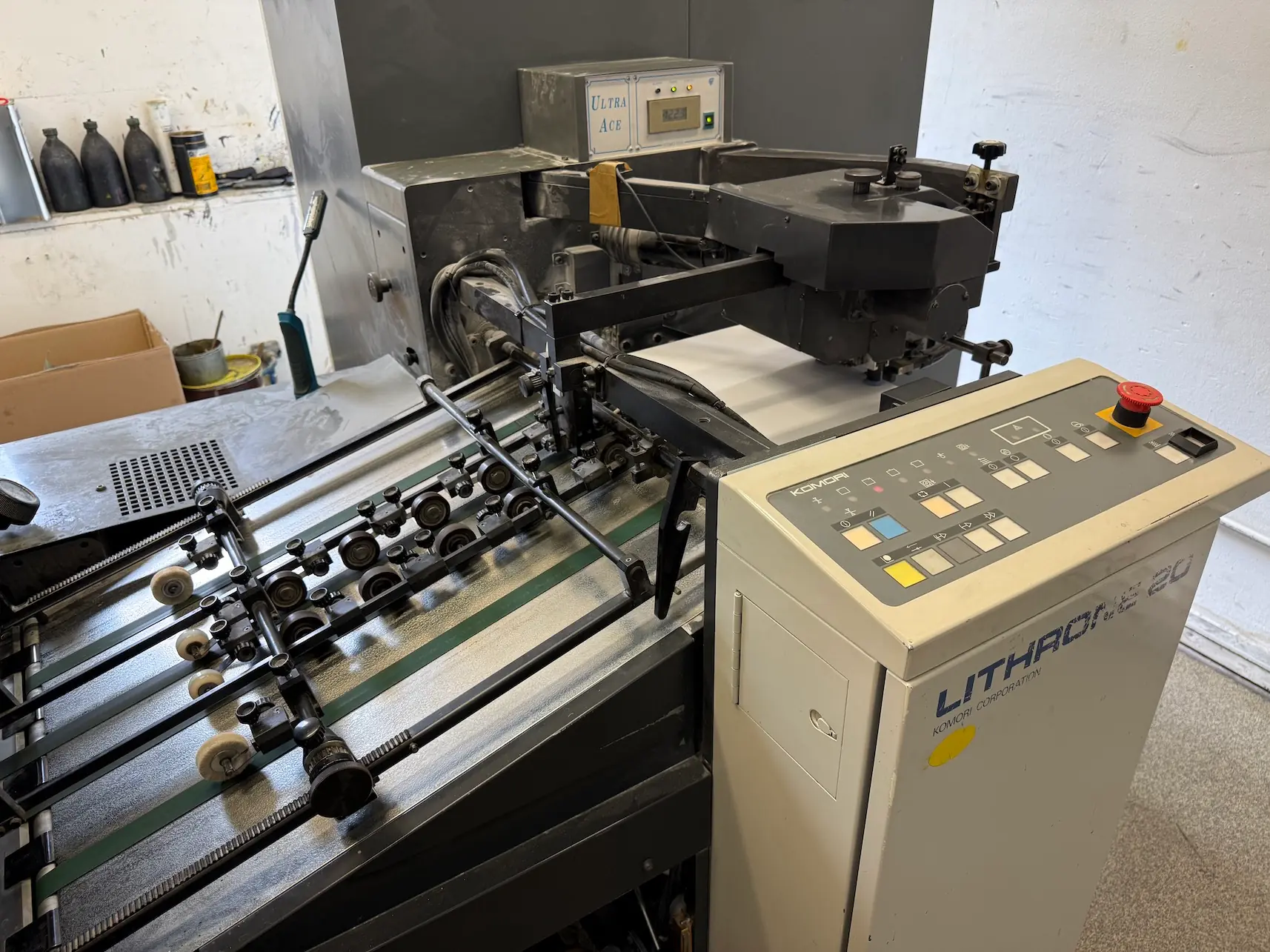 Komori Lithrone 520 + L, built in 2001, is a 5-color offset printing machine with coating unit, engineered for short and medium-run jobs that demand superior color stability and finishing.
