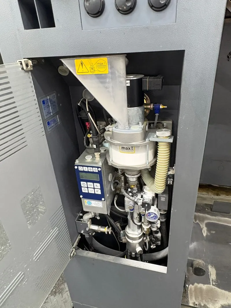 This press is equipped with a coater unit featuring a chamber coater and anilox roller, allowing consistent coating application for high-quality finishes. The integrated UV drying system includes two UV lamps in the interdeck and three UV lamps in the delivery, supported by IR dryers, ensuring fast ink curing and immediate handling of printed sheets.