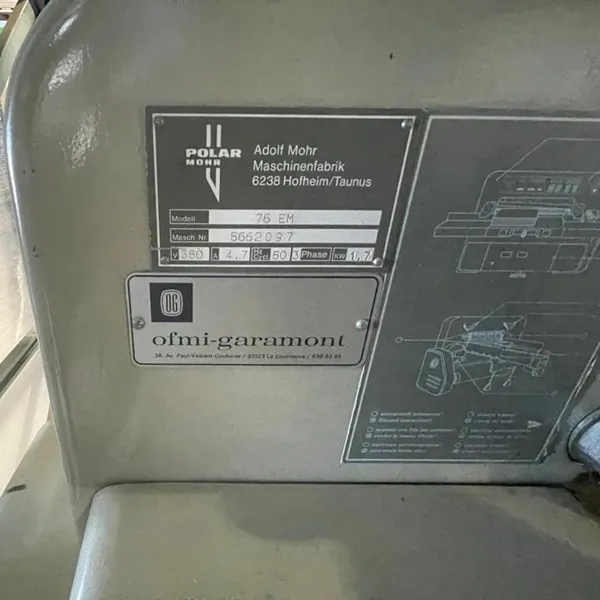 The Polar 76 EM (1986) is a durable industrial guillotine paper cutting machine, designed for efficient and precise cutting in small to medium production environments.