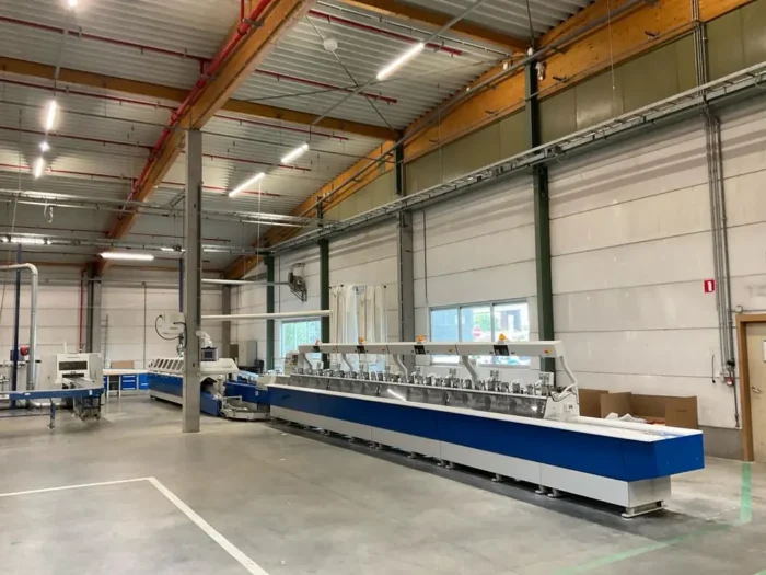 A versatile binding solution for booklets and brochures, combining gathering stations with booklet binding and a three-knife trimmer for clean finishing. Built in 2005, designed for high-volume book production.