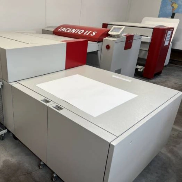 جهاز Agfa Acento II S CTP حراري (موديل 2007) — صناعة بجودة عالية، يجهز زينكات بدقة 2400 dpi وبسرعة توصل لـ 21 زينكة/ساعة. الجهاز بحالة ممتازة وجاهز للعمل، ومعاه Plate Manager و Azura C95 ووحدة ثقب وتكديس.