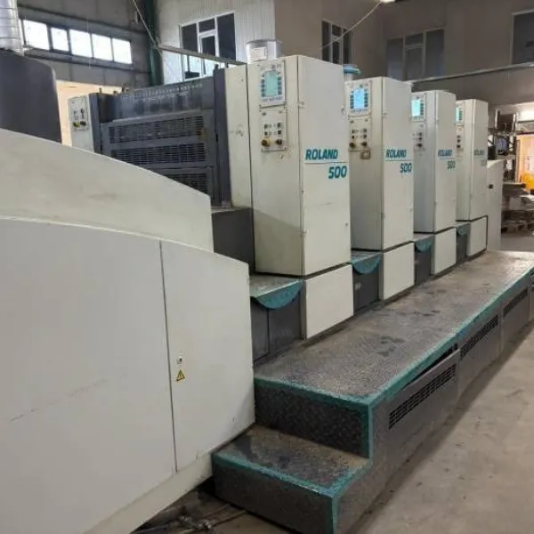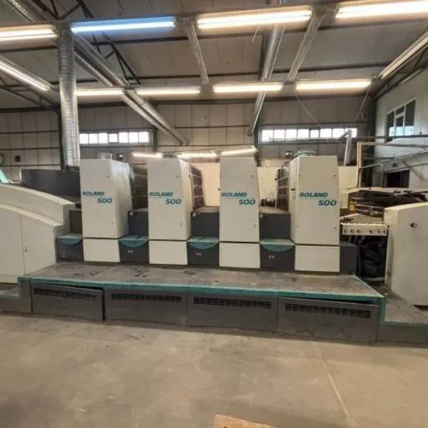 ماكينة مان رولاند 504 F موديل 2000 هي ماكينة أوفست 4 ألوان مستقيمة مصممة لبيئات الطباعة التجارية الاحترافية. تعمل بمقاس أقصى 74 × 59 سم وتتعامل مع خامات حتى سماكة 1 مم، مما يجعلها مناسبة للورق والكرتون الخفيف.
