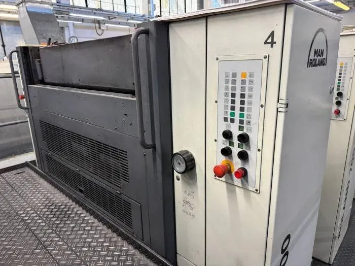 ماكينة مان رولاند R705 LV UV Hybrid موديل 2002 هي ماكينة أوفست شيت فيد 5 ألوان بمقاس كبير 104 × 74 سم، مصممة لطباعة الباكجنج والتطبيقات بنظام UV Hybrid. مزودة بنظام لمبات UV ARADIANT، ووحدة طلاء TRESU، ومجفف IR وهواء ساخن، ومغذي وتسليم Non-Stop، ونظام تحكم RCI متطور. خيار قوي لمصانع علب الكرتون ومطابع الباكجنج