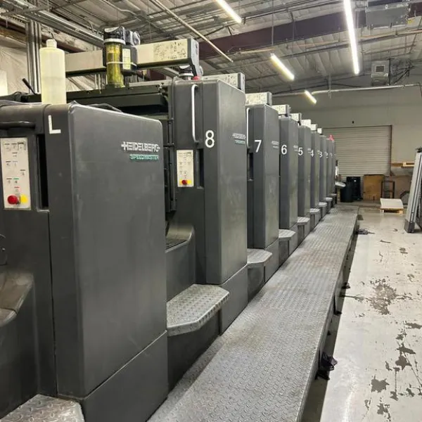 ماكينة هايدلبرج SM 102-8P L موديل 1999 هي ماكينة أوفست شيت فيد 8 لون مزودة بخاصية الطباعة على الوجهين، بالإضافة إلى وحدة طلاء Inline ودراير IR، مما يجعلها مناسبة للتغليف والإنتاج عالي الجودة.