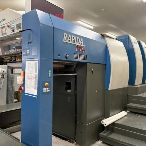 ماكينة KBA Rapida 106-4 موديل 2014 هي ماكينة أوفست شيت فيد حديثة بمقاس كبير 106 × 74 سم، مصممة لبيئات الطباعة الصناعية في مجال الباكجنج والطباعة التجارية عالية الكفاءة.