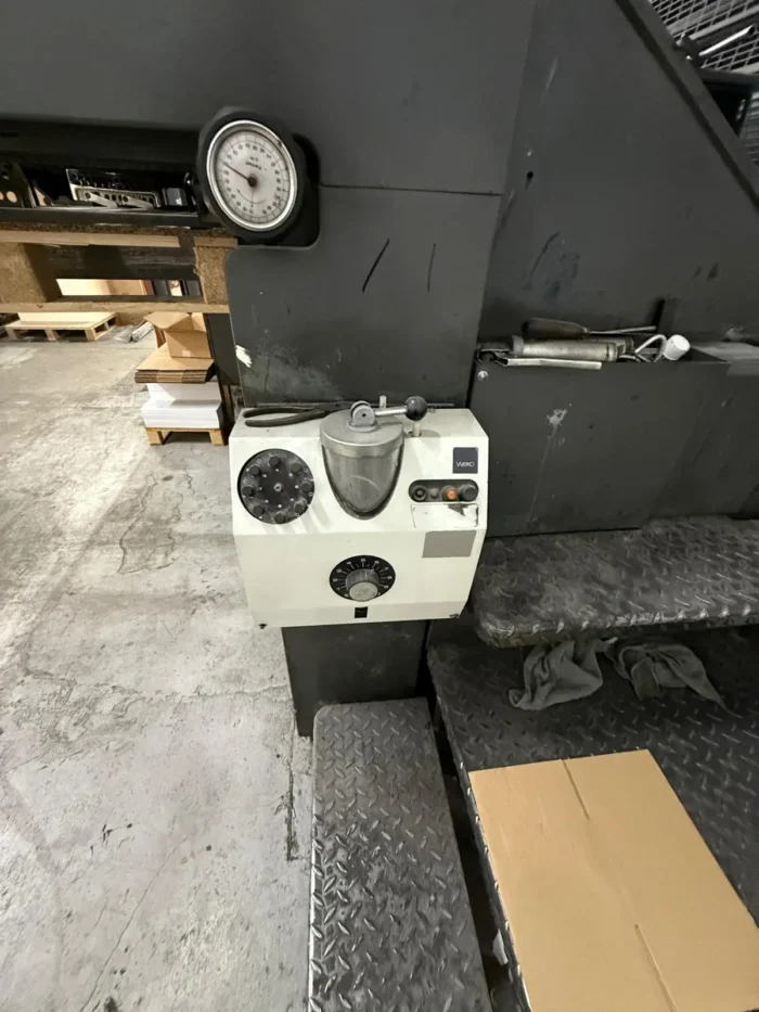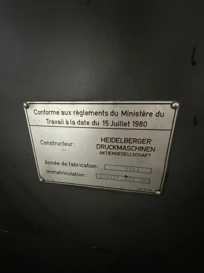 ماكينة Heidelberg SM 102 ZP (1986) هي ماكينة طباعة أوفست لونين مزودة بنظام ترطيب Alcolor ونظام رش بودرة مع قفل سريع للألواح (Quick Action Clamp).