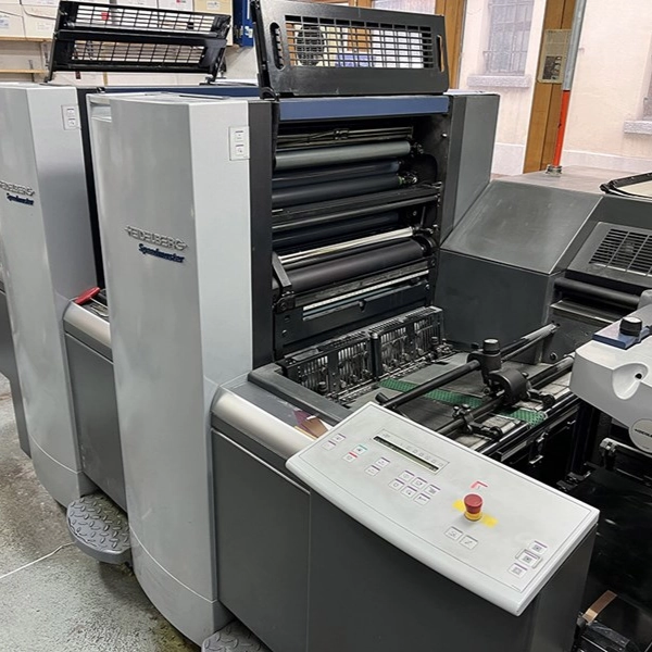 ماكينة أوفست ألمانية بمقاس 37×52 سم مزودة بنظام تحكم CP Tronic، أوتوبليت EasyPlate، إعداد مقاس أوتوماتيكي Preset، نظام ترطيب Alcolor، تبريد Baldwin، غسيل أوتوماتيكي كامل، سكاكين حبر ليزر مقسمة، ورش بودرة Mediprint. عداد 40 مليون فقط وسرعة 13,000 شيت/ساعة.